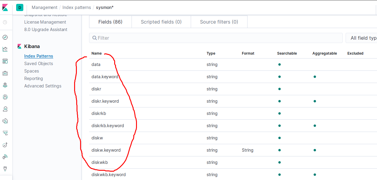 the data is showing up in Discover, and I can see my custom fields w data (diskio, pid, data,etc)