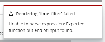 Every now and then when reloading a workpad that contains a time filter the following exception is shown: "Rendering 'time_filter' failed. Unable to parse expression: Expected function but end of input found." (see image)