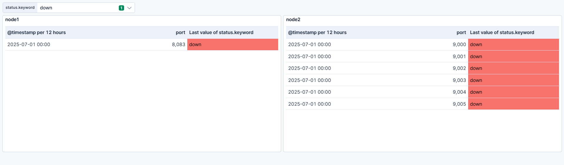 I have one dashboard to showing uptime monitor. It shows all ports for 2 different nodes. So 2 panels with name 'node 1' and 'node 2' and 2 tables for each (same but with filters for dedicated nodes). Tables shows the list of ports and status (up or down).