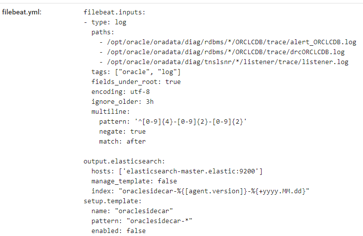 I am trying to generate custom index into elastic search from filebeat with the following config: (using both 7.1.0 versions) , but unable to see this index - oraclesidecar-%{[agent.version]}-%{+yyyy.MM.dd} on the elastic search / kibana management index page. Any ideas why / what is wrong in the below config?