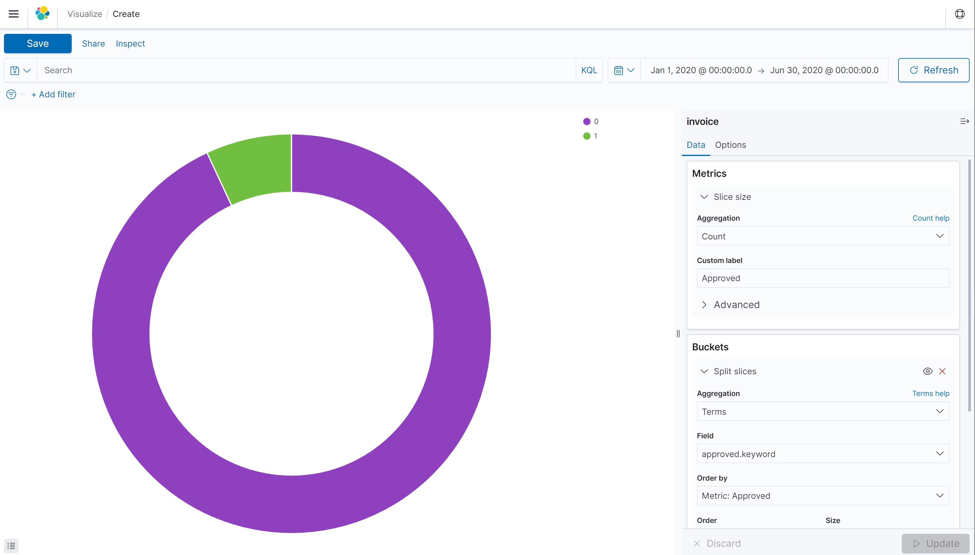 I am using AWS ES Kibana and I created a pie chart to figure out the number of 1's and 0's of a certain field ("approved"). This was created with Metrics - Aggregation: Count, Buckets - Split Slices, Aggregation: Terms, Fields - approved.keyword.