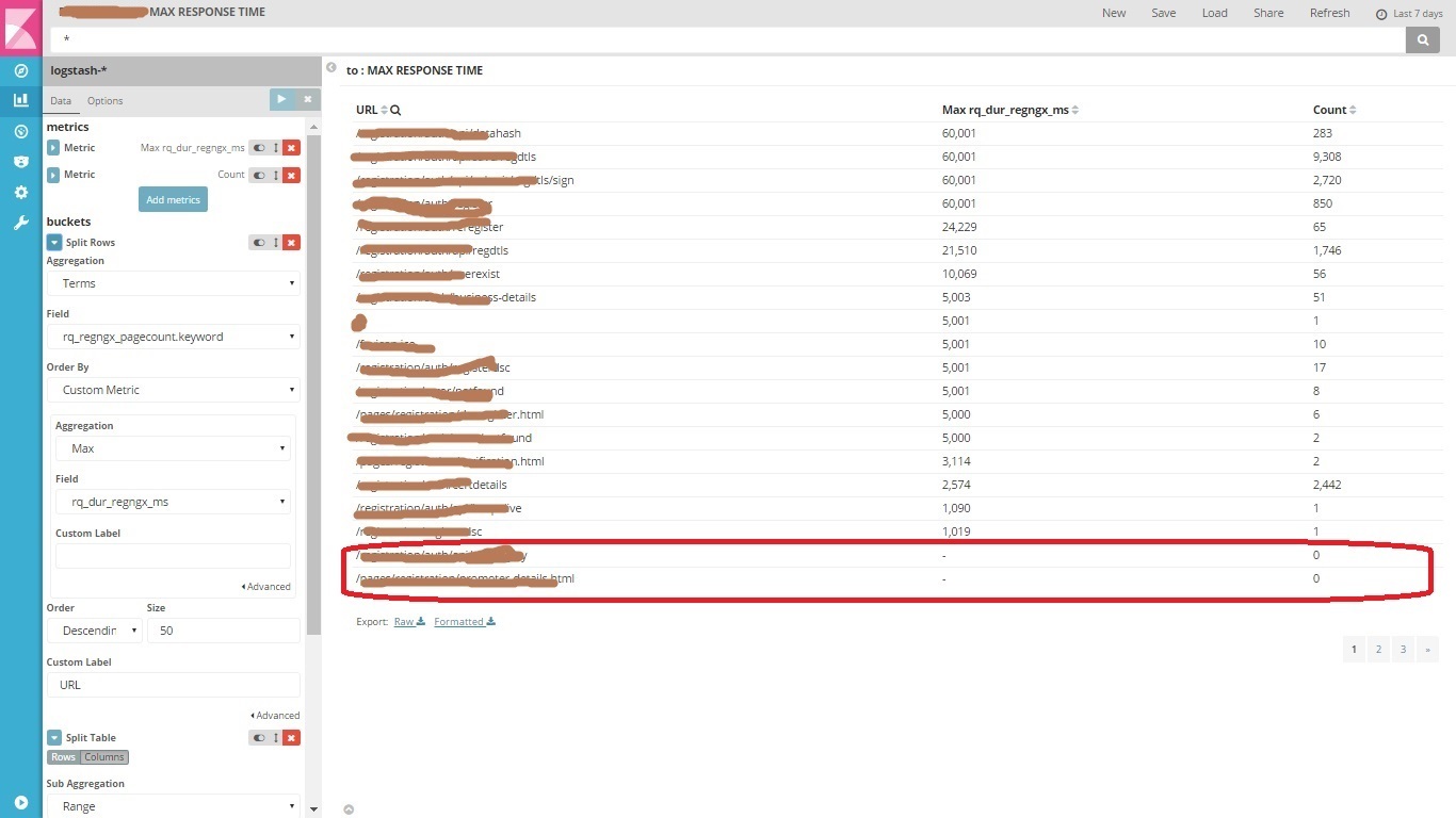 Each NGINX access log provides the URLs been hit by user. I need to create a datatable containing only the URLs which took maximum response time more than one second with the count of URLs. So the table should contain 2 columns.