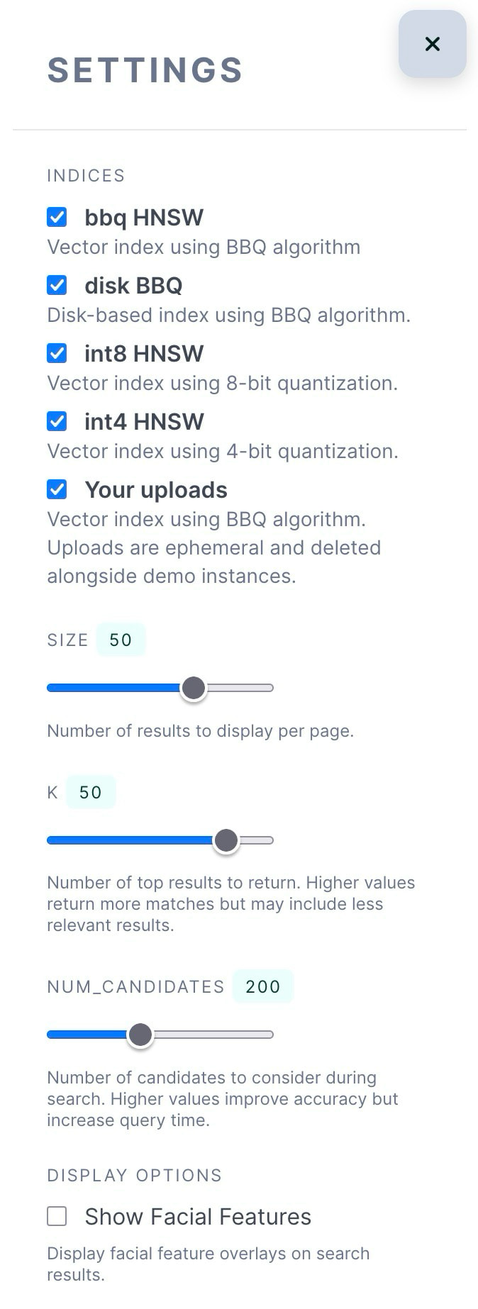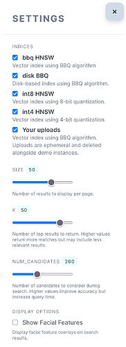 In Settings, you can experiment with these parameters to balance speed and accuracy, and select which indices will be considered on the query:
