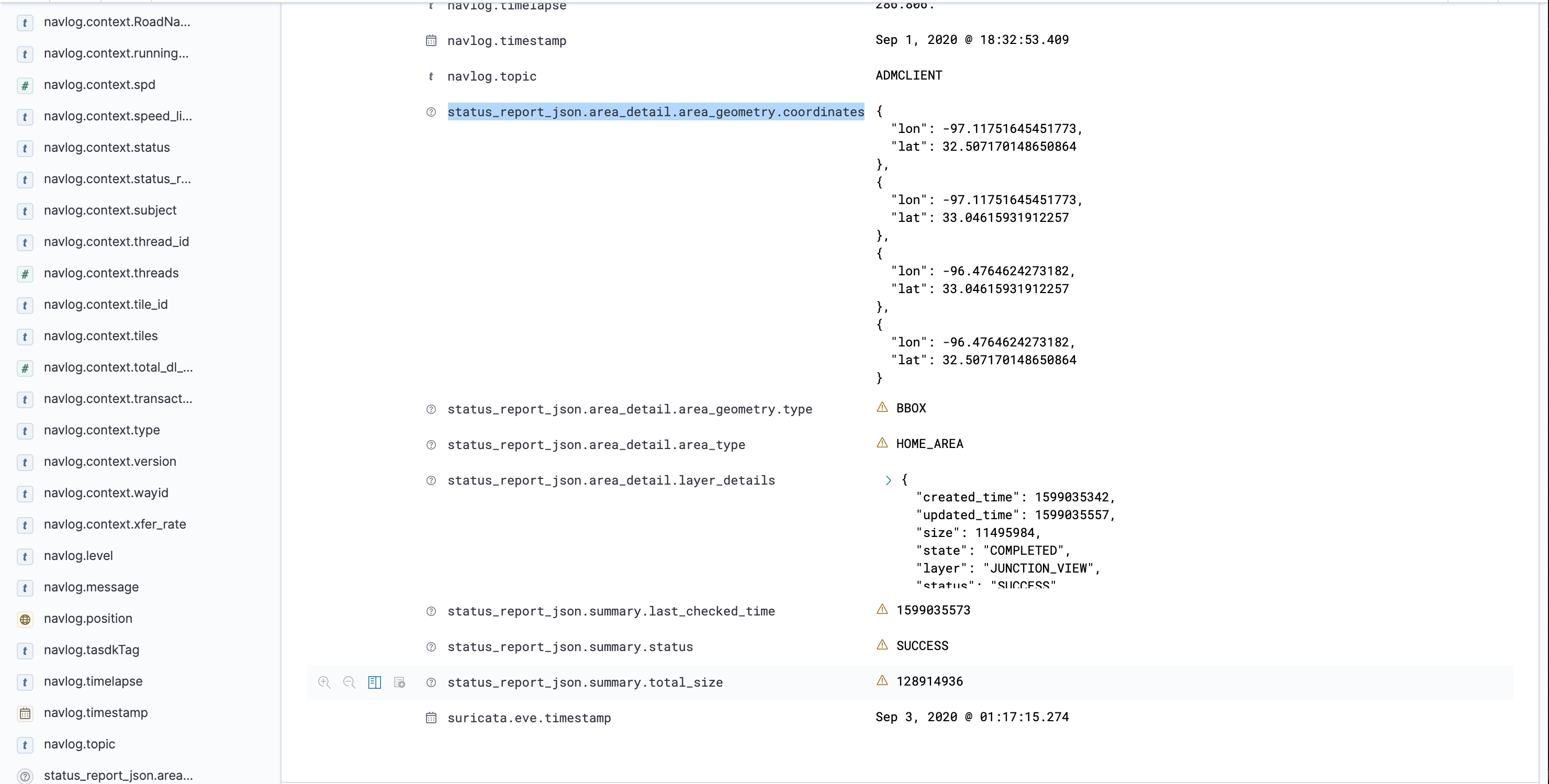"status_report": "{"summary":{"status":"SUCCESS","last_checked_time":1599035573,"total_size":128914936},"area_detail":{"area_type":"HOME_AREA","area_geometry":{"type":"BBOX","coordinates":[{"lat":32.507170148650867,"lon":-97.11751645451773},{"lat":33.04615931912257,"lon":-97.11751645451773},{"lat":33.04615931912257,"lon":-96.4764624273182},{"lat":32.507170148650867,"lon":-96.4764624273182}]},"layer_details":[{"layer":"JUNCTION_VIEW","state":"COMPLETED","status":"SUCCESS","size":11495984,"created_time":1599035342,"updated_time":1599035557},{"layer":"LANDMARK","state":"COMPLETED","status":"SUCCESS","size":6574073,"created_time":1599035342,"updated_time":1599035573},{"layer":"STREET","state":"COMPLETED","status":"SUCCESS","size":14518781,"created_time":1599035342,"updated_time":1599035345},{"layer":"MAP","state":"COMPLETED","status":"SUCCESS","size":84938399,"created_time":1599035342,"updated_time":1599035436},{"layer":"POI","state":"COMPLETED","status":"SUCCESS","size":11359236,"created_time":1599035342,"upd