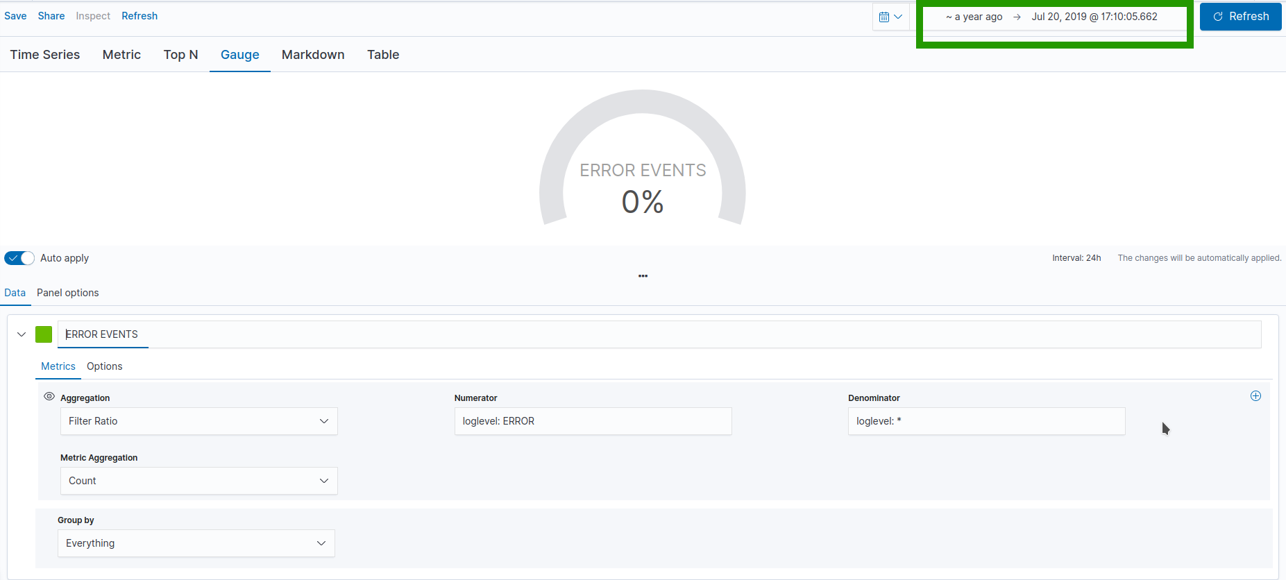 I wanted to make a percentage of the error events over the total (log_level: ERROR / log_level: *) and I'm using the filter ratio agg of the VB Gauge, as I successfully did in the past.