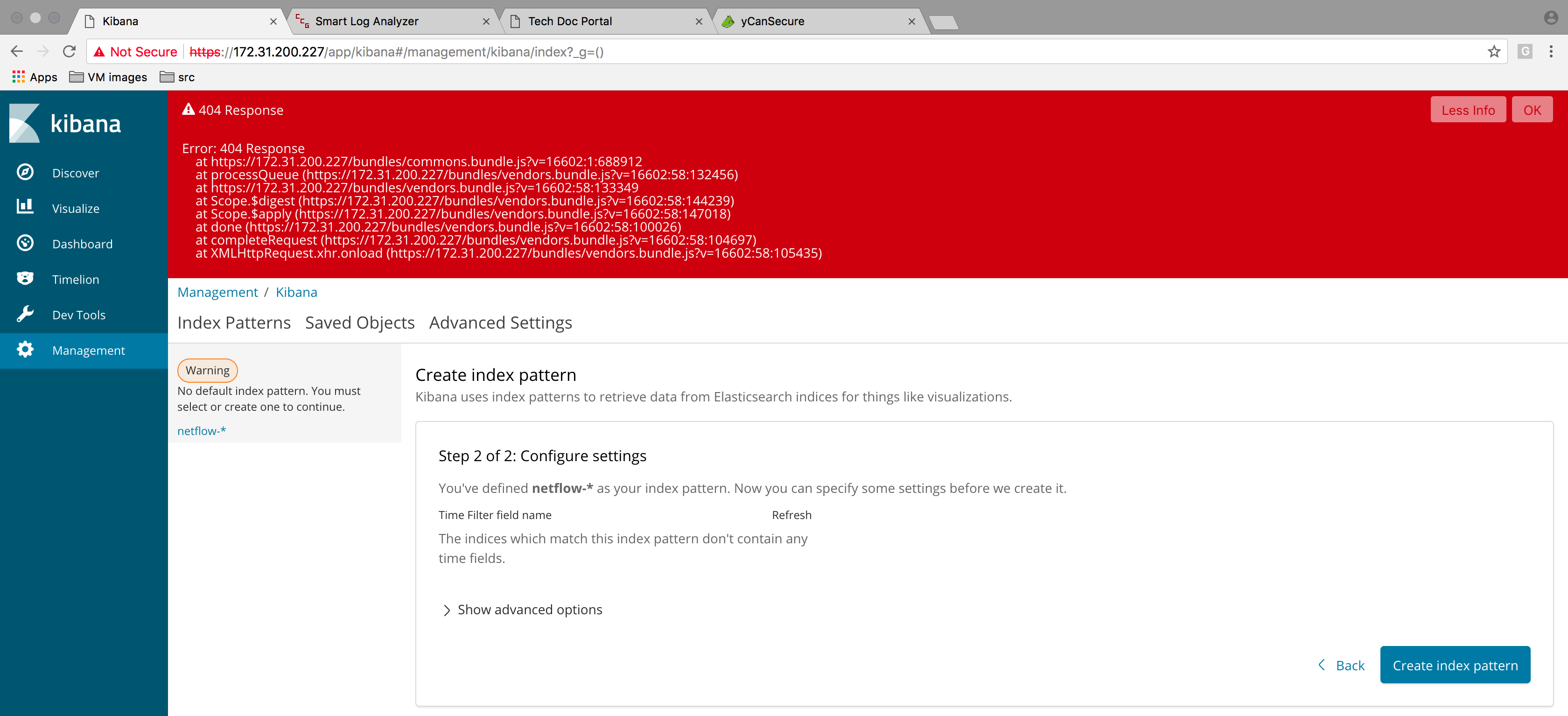 I'm trying to put Apache proxy in front of Kibana and I have made a config file for apache. But when I start to create index pattern in Kibana interface, the 404 error prompts. From the first image, there is a match there and it should work. When I hit the next button, there will be an error there. I can see in the error it reports about /172.31.200.227/bundles/, but I have added the bundles in the proxy config file. Any suggestion? (BTW, the Kibana works fine without the proxy)
