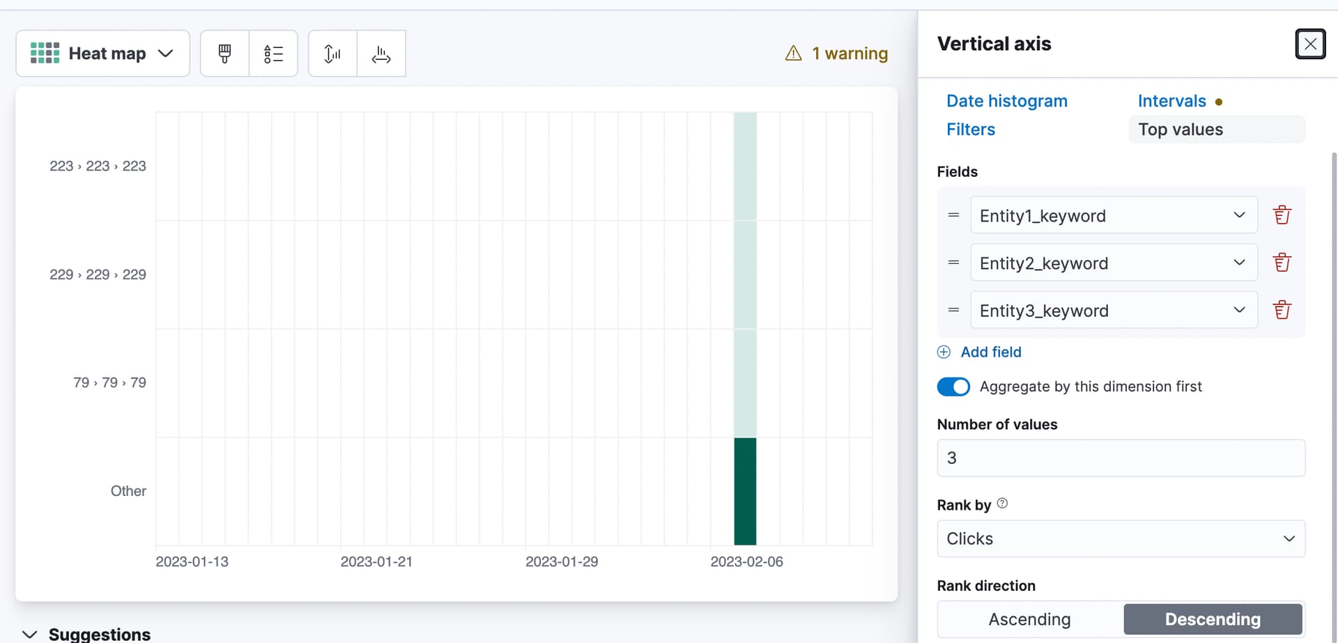 Hi, I have an issue with kibana dashboards. I want multiple fields in index (Entity1.keyword, Entity2.keyword and Entity3.keyword) to be sorted by max clicks against date. Entities will be in Y axis and Date will in X Axis. But the moment i add multiple keys in Y axis (keeping X axis as dates), data in multiple fields are showing like a row (field1>field2>field3) - screengrab attached. I want distinct key values and not in row form. Can u help in this please. Dashboard is heatmap type.