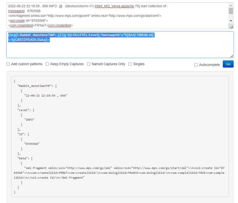 I need to grok the datetime logelevel message id and the first line of xml(</Xml-fragment xmlns: sol ="http://www.rabitmq.com/was/xml/complte" xmlns:ns2="http://www.rabitmq.com/was/xml/complte">) . starts with< and ends with >.