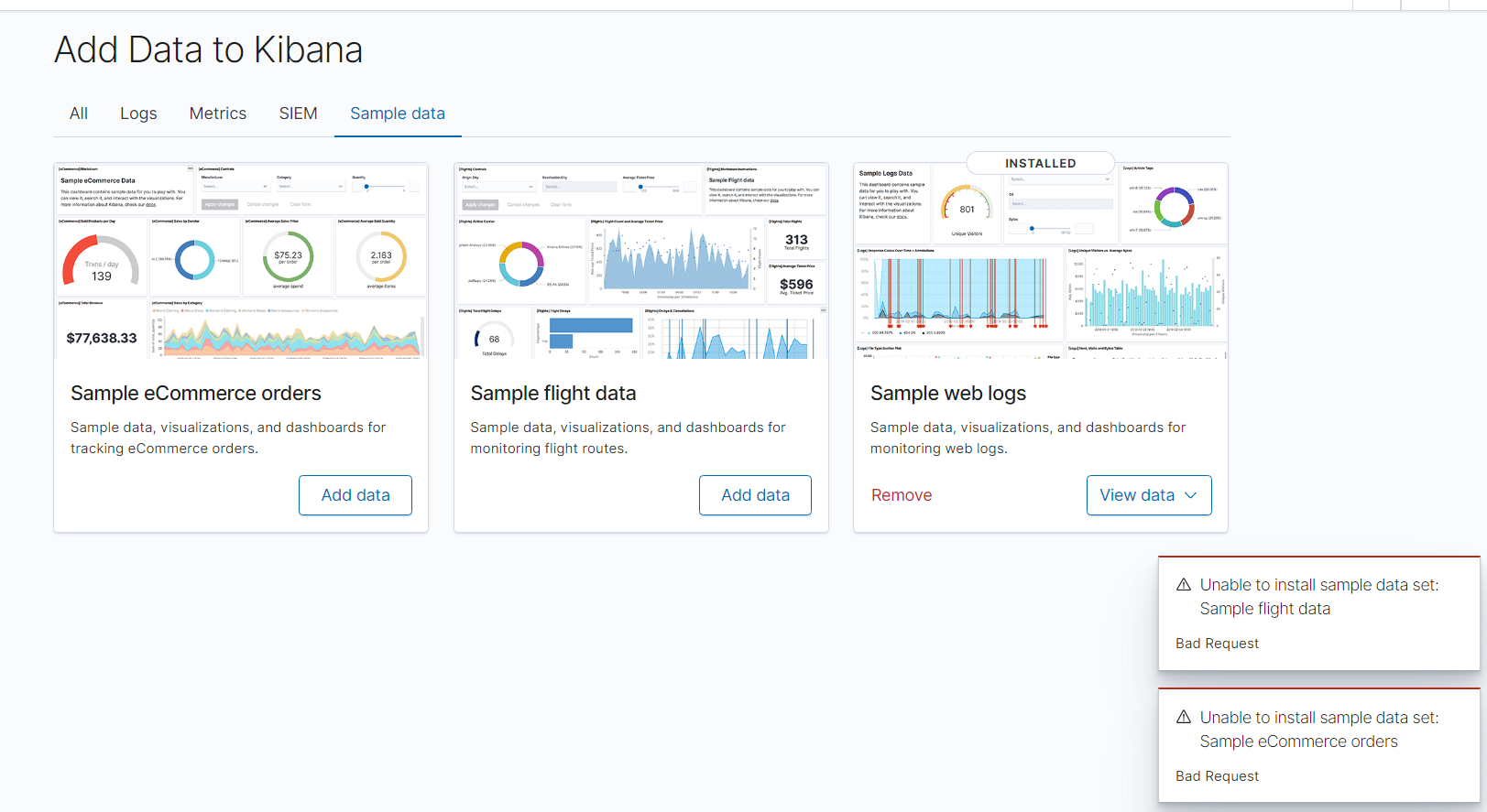 After going through the steps for Lab 9.3: Reporting and Saved Objects, I get the following error when trying to import the file export.json back (see image attached) . In addition, I am now not able to Install Sample Data for the E-commerce and Flight data. Please advise on how to resolve this issue as it is frustrating to get to last step in the Data Analysis with Kibana (On-Demand) class and have the environment crash and not work. Thank you in advance for all your help.