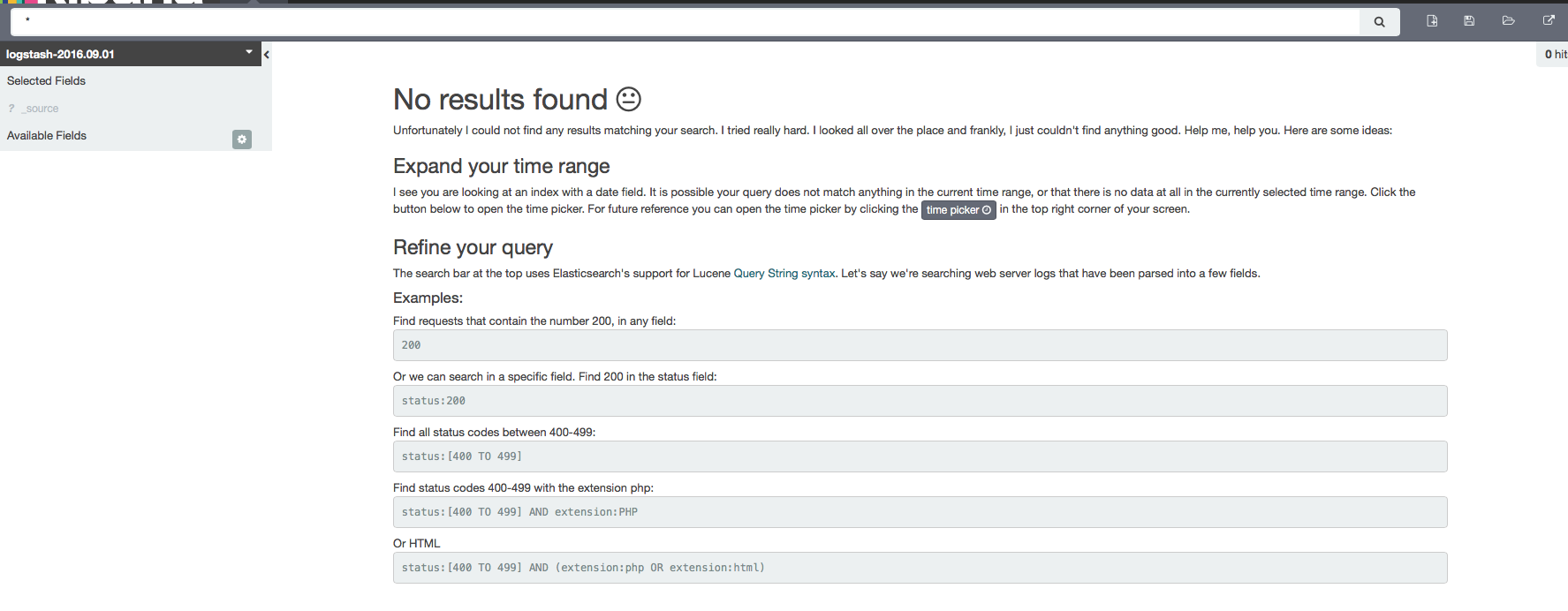 - 1, yes i do have 2016.09.01 index as below shows. However, Kibana Discover says "No Result Found". I now can find it in yesterday though. In Setting views, everything shows normal. I am very afraid tomorrow or next week it disappeared again.
