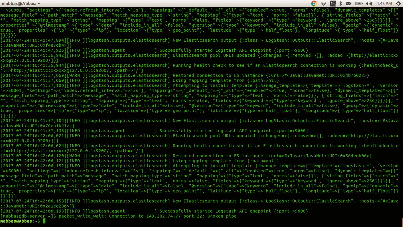 [2017-07-24T12:17:46,671][INFO ][logstash.outputs.elasticsearch] New Elasticsearch output {:class=>"LogStash::Outputs::ElasticSearch", :hosts=>[#Java::JavaNet::URI:0x4907425a]}