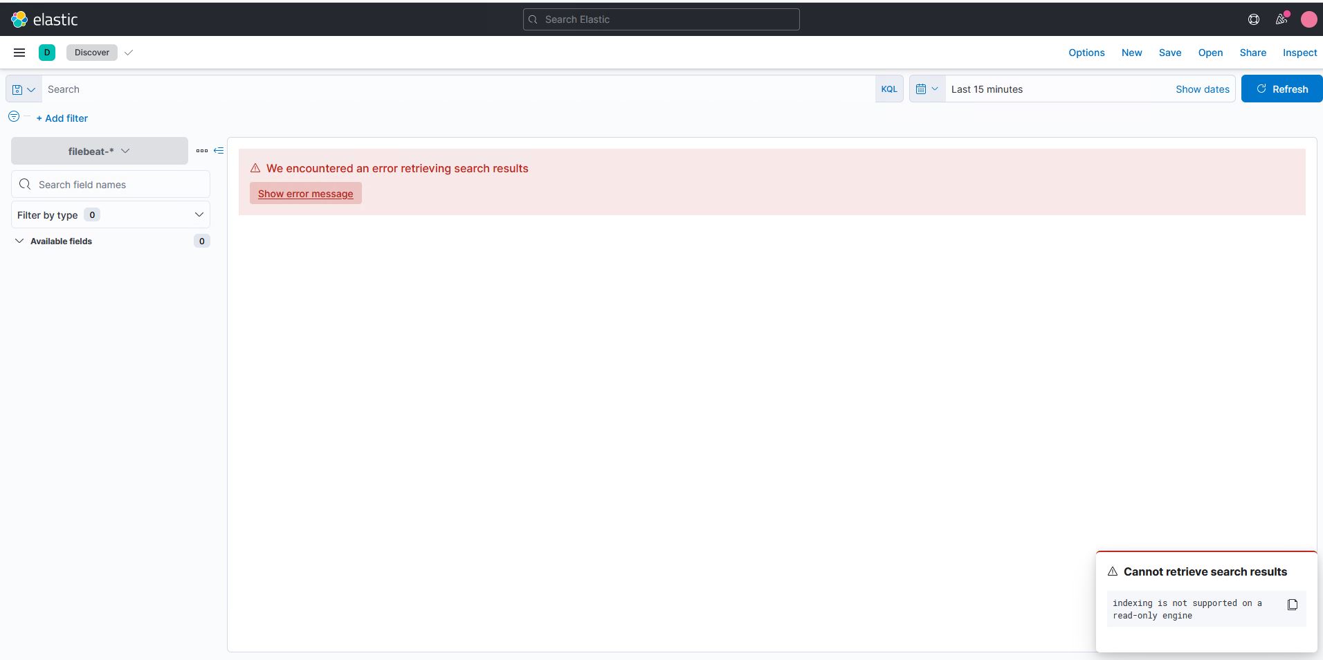 I have an issue with KIbana Disocver module. I cannot search in my indices. The error I see is : "indexing is not supported on a read-only engine". All my indices are with status green.