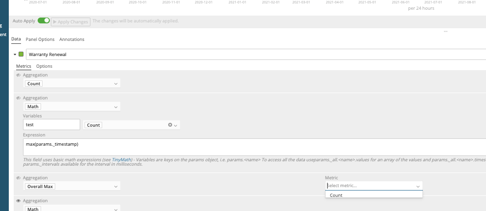 My current approach is to take the timestamp of the last bucket and then subtract the warranty-end timestamp for each document from that, however I'm unsure of how to access the timestamp of the last bucket in a TSVB, or elsewhere for that matter.