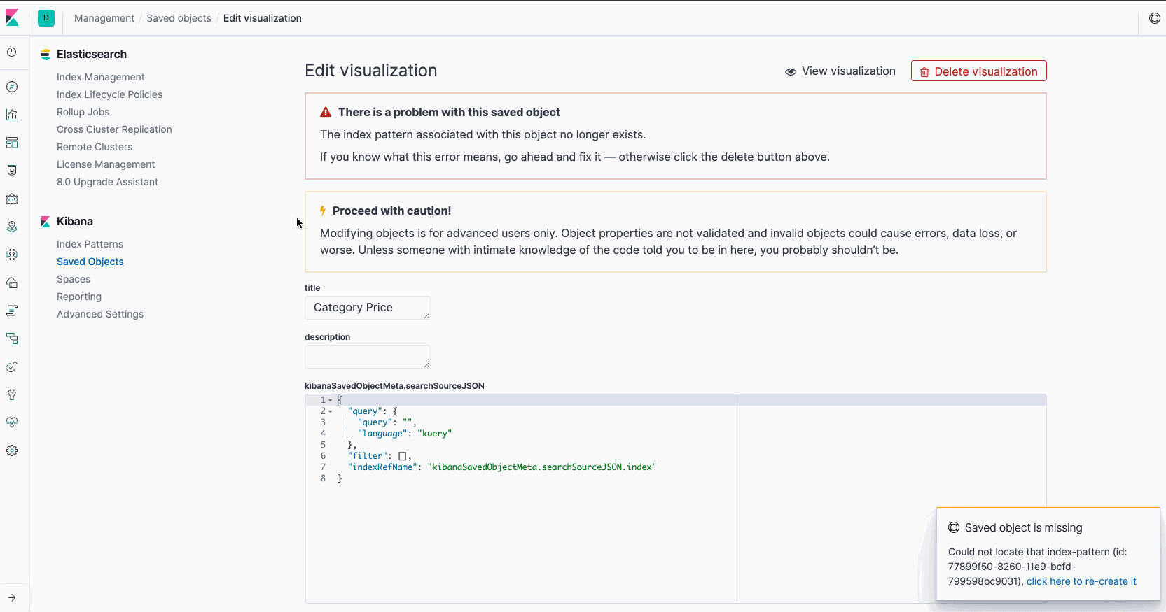 If you've deleted the index-pattern which the various Visualizations are associated with, when you go to view the Visualization itself in Visualize, you'll be redirected to the "saved object management" screen: