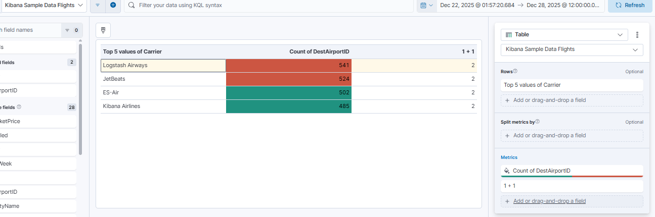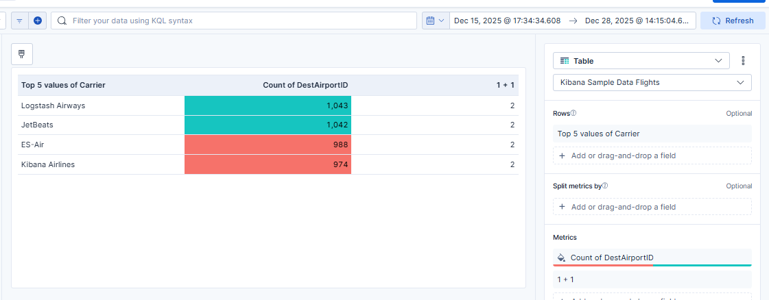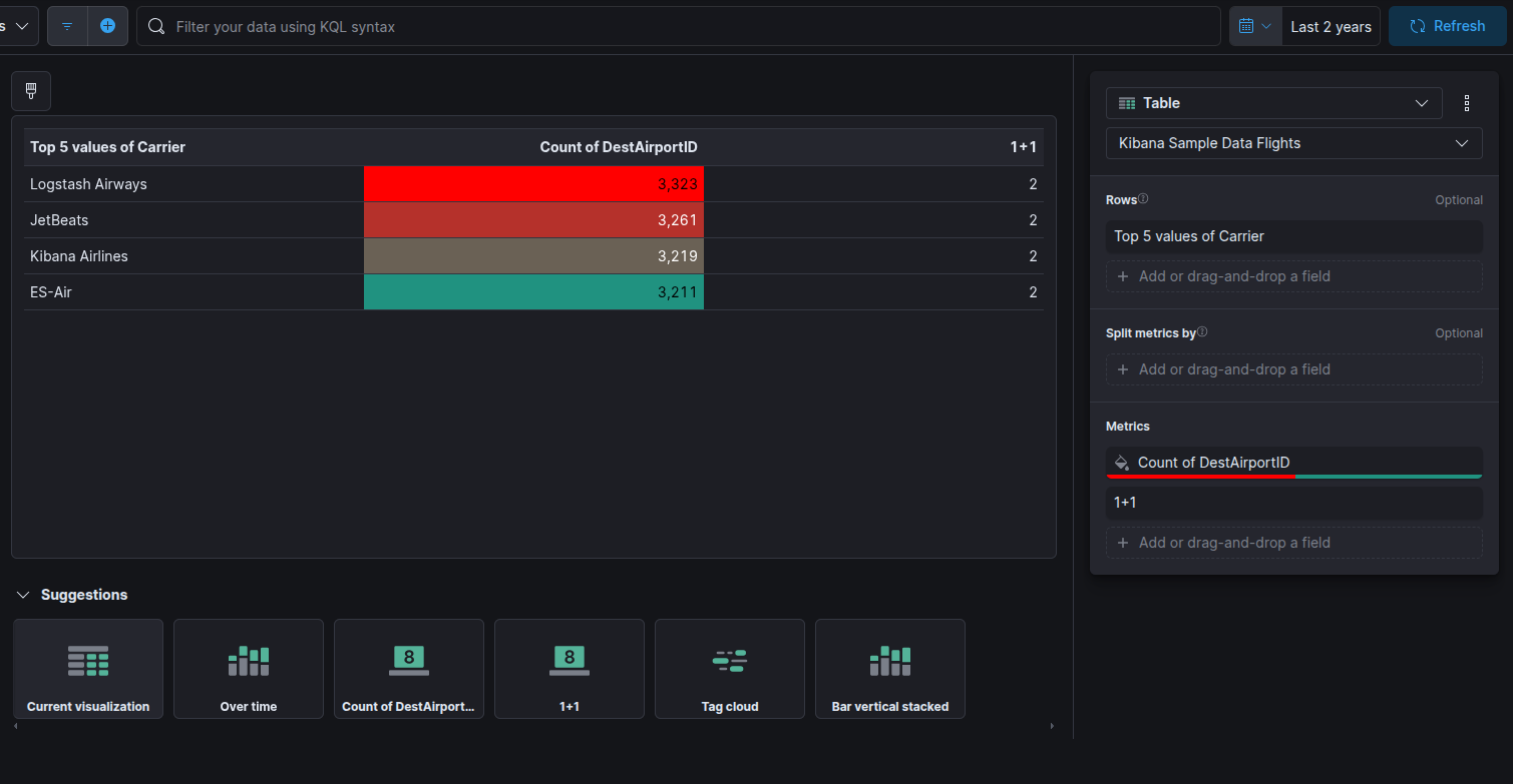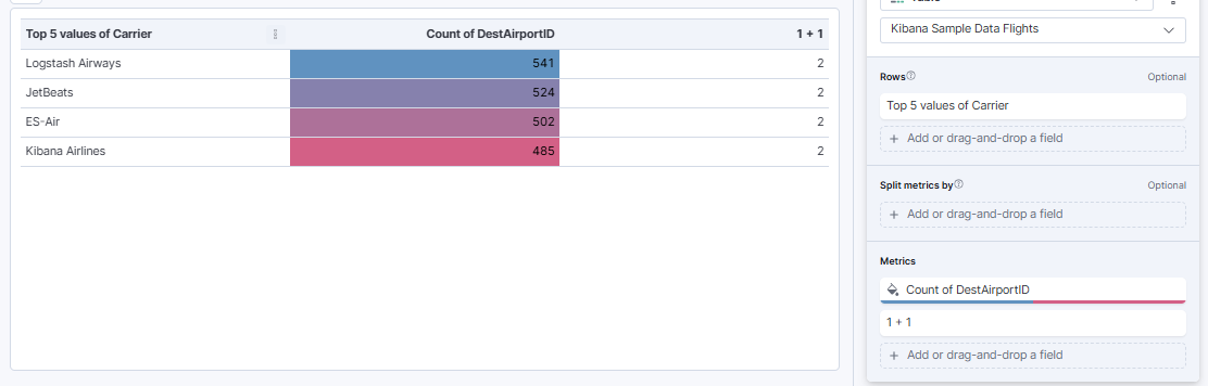 I’m using the Sample Flight data set and I’ve created a Lens Table with “Rows: Top 5 values of Carrier” and Metric “Count of DestAirportID”. I set the metric to color by value (Cell) with value >= 3000 as one color and anything less as another color. I can add more metrics with separate color options and the table works correctly, but as soon as I add a metric that uses a formula, it changes the coloring of other metrics. Example, I added a simple metric with formula “1+1” and this is the result:
