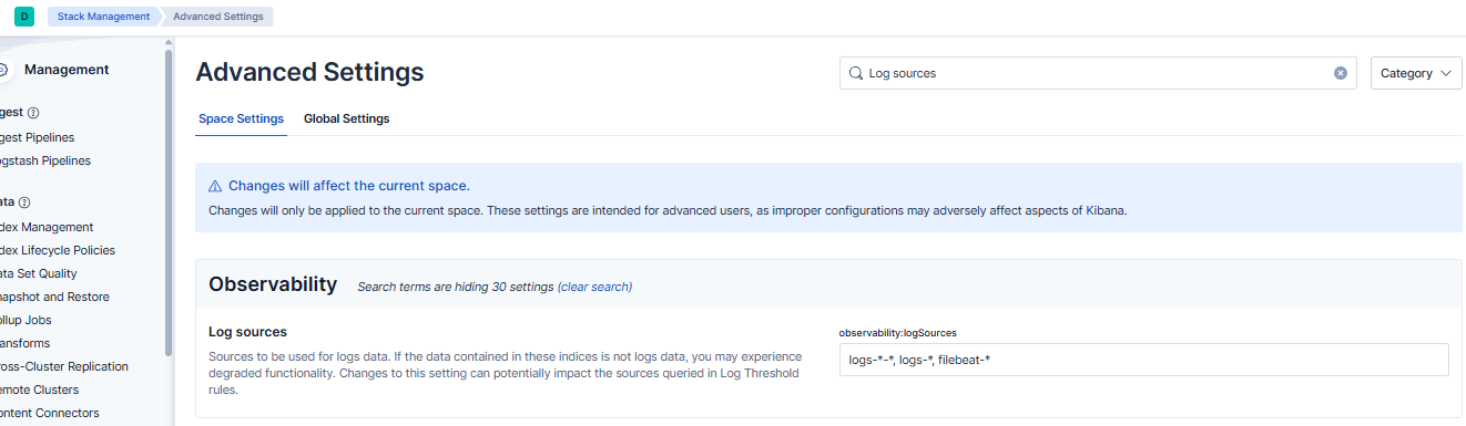 Choose indices By default, Machine Learning analyzes log messages in all log indices configured for the log sources setting. You can choose to only analyze a subset of the index names. Every selected index name must match at least one index with log entries. You can also choose to only include a certain subset of datasets. Note that the dataset filter applies to all selected indices.