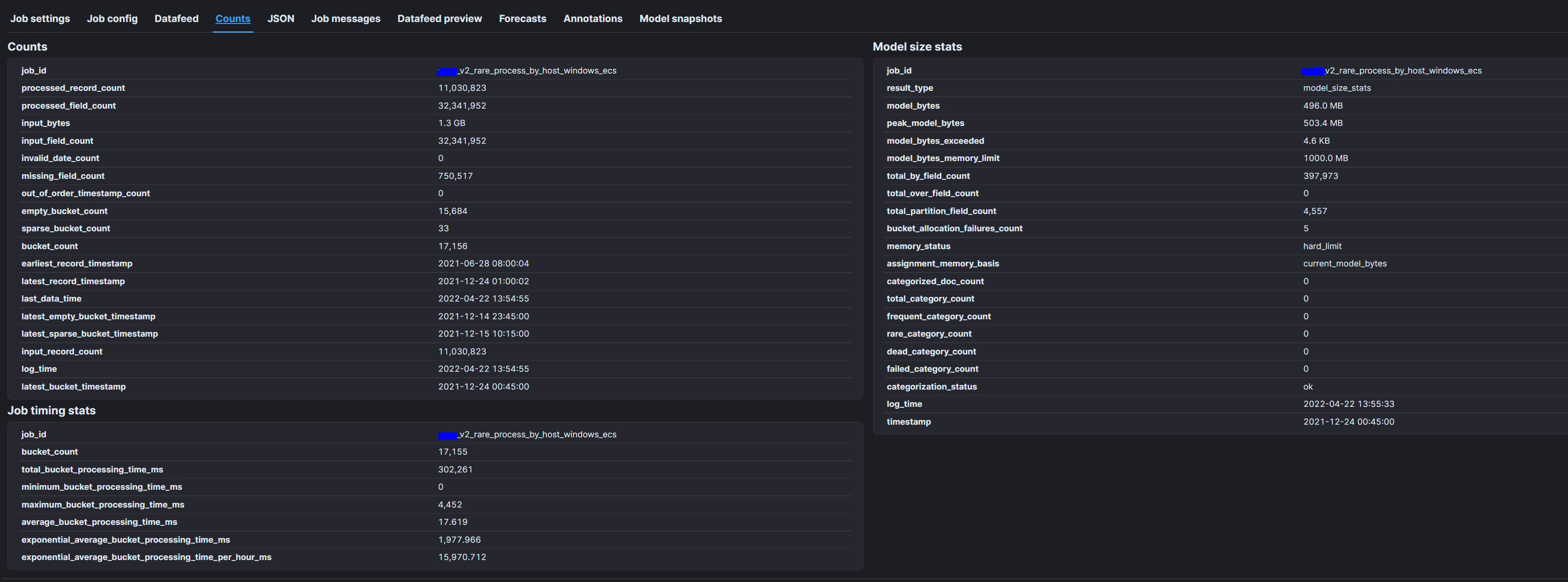 rare by "process.name" is misleading syntax rare("process.name") would give a better intuition. (The reasons for this being configured like this are lost to the sands of time.) In fact, for memory purposes rare by "process.name" is much lighter weight than say count by process name. It summarises bucket counts containing each distinct process.name rather than trying to model them each as a time series. Where as a time series model might be 10-20KB this might be 10-20B (once you take into account other bookkeeping state). However, we generally advise against doing rare by "process.name" on some astronomically high cardinality field: rare is generally meaningless for such data.