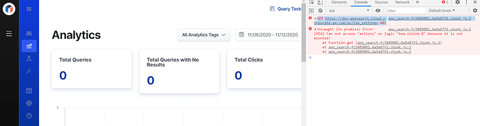 Given the breadth of errors, I'm wondering if Enterprise Search is having trouble connecting to Elasticsearch, although I doubt the app would load as far as it did if it wasn't. I'll ask around to see if this analytics data is stored in a different way/place that perhaps your instance is finding uniquely unaccessible.