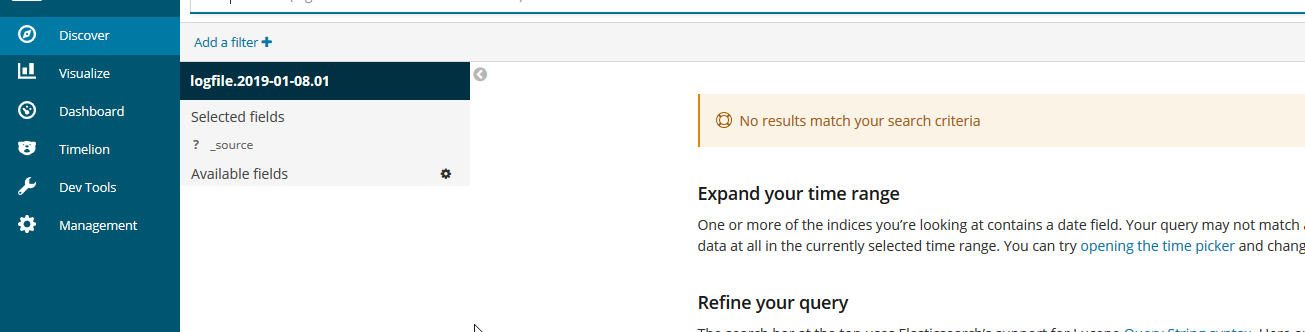 My problem is that when I try to create an index pattern for this file and try to use the "time filter" in Kibana there are no results shown in "Dicover".