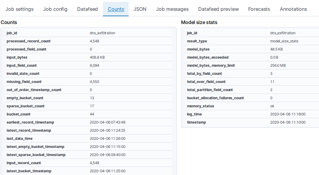 In order to assure "normal background DNS traffic" into my packetbeat index, I have created a script which queries at every 25 sec. for one of the domains (google.com, facebook.com, youtube.com, twitter.com, etc.). In the hours that come, I plan to increase the bucket_span value in order to get empty_bucket_count: 0. In this way, I think the ML model will be in a perfect state for detecting anomalies. I have a question: in the Counts Tab of a job, the only fields I should look for are empty_bucket_count and bucket_count? I guess the others are not so important for paying too much attention.