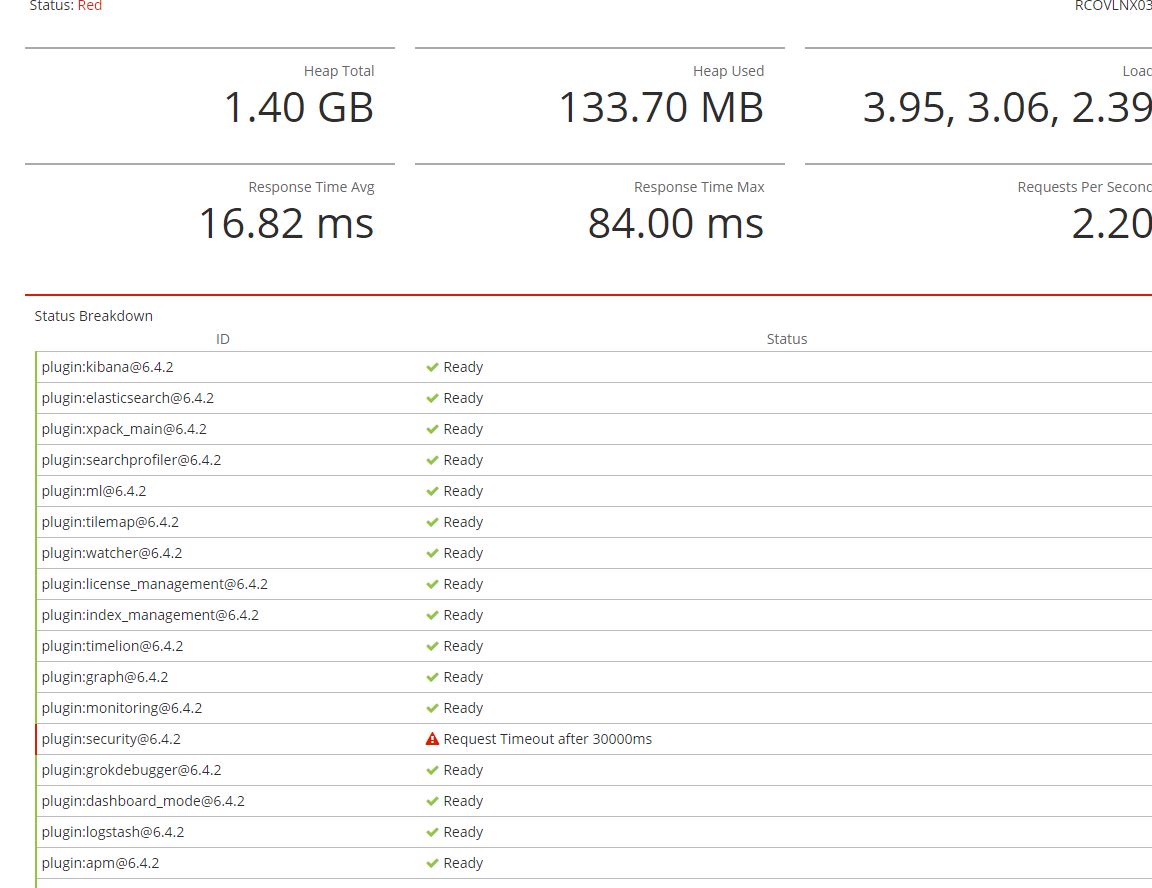 I was successful in setting up my production instance , which consists of 3 masters, 2 data's and 1 client and setup was working as expected for quite some time now, However, I am getting strnge page response on my kibana screen, which says the my client node machine status is RED and heap is around 1.4 GB, It also shows that the security plugin is not responding within 3000ms
