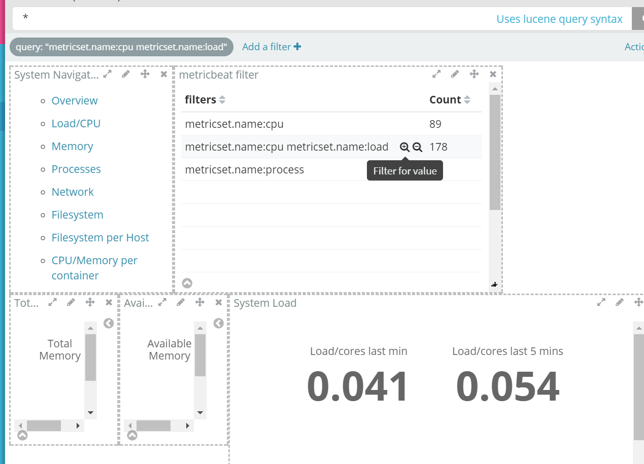 Then I added this new visualization to an existing metricbeat dashboard. Now I can mouse-over any of those filters and click on the + to add a filter to the dashboard like that. The just delete the filter when you want all results again.