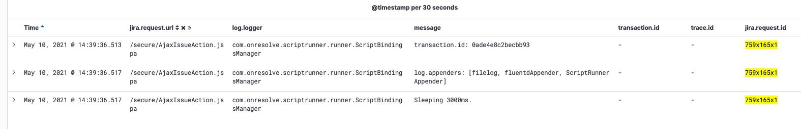The APM Agent Property enable_log_correlation is set to true and I also set trace_methods=com.onresolve.scriptrunner.runner.AbstractScriptRunner#runScript, which I can find using APM Observability.