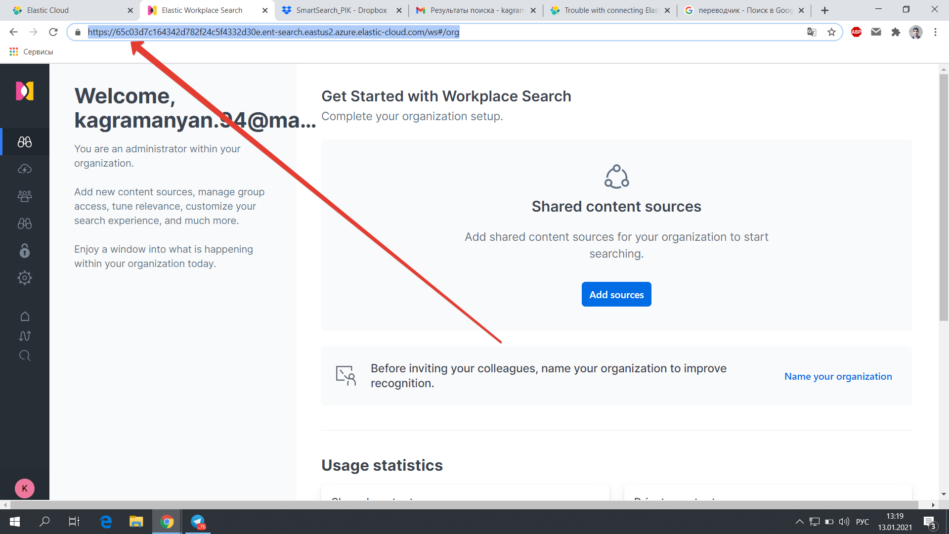 When you login to Workplace Search, you have to enter the URL in your browser. If you launched via Elastic Cloud and you just clicked a link to go to Workplace Search, you can grab the hostname from your browser's URL bar.