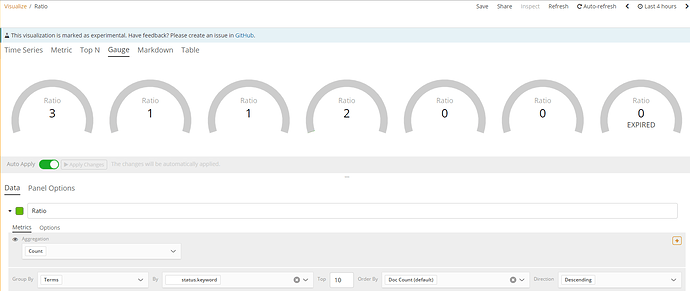 I created a single 'Count' grouping by 'Terms' let's call it 'StatusConnection' and I've got all my different gauges at 0 with the time slot 'Today'. If I now set this time slot at 'Last 12hours' all my different gauges show me a number