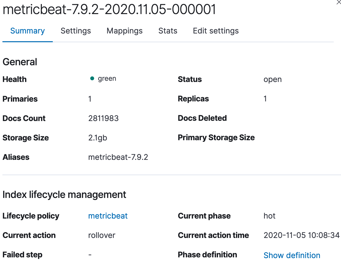 Now, when I take a look at the indices, I can see one huge index metricbeat-7.9.2-2020.10.14-000001 (started metricbeat on 14th). Why its happening like this and how can I fix this, to achieve what I am looking for?